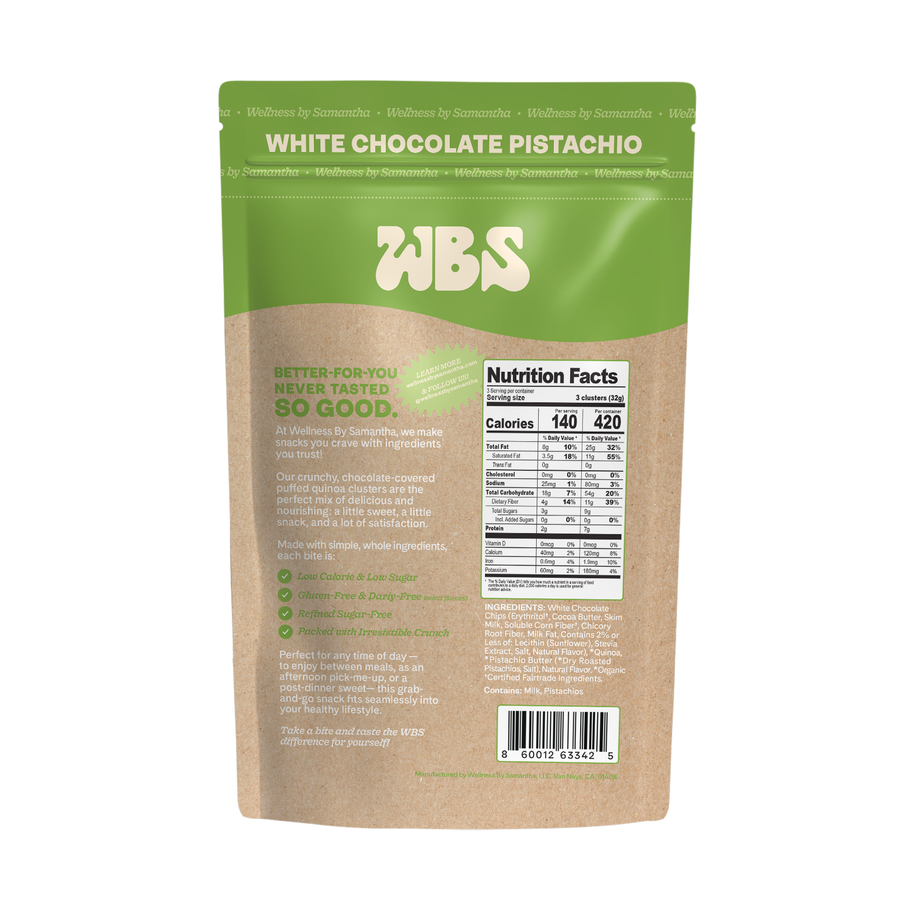 *Quinoa, White Chocolate (Cocoa Butter, Erythritol, Milk (rBST Free), Dextrin, Chicory Root Fiber, Milk Fat (rBST Free), Sunflower Lecithin, Salt, Natural Flavor, Stevia Extract), *Pistachio Butter (*Pistachios), Pistachio Natural Flavoring, Himalayan Salt. *Organic.